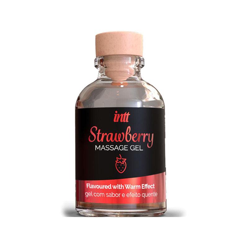 Massage Gel Strawberry de INTT es un gel de masaje con aroma y sabor a dulce fresa que añade un agradable y cálido efecto calor.